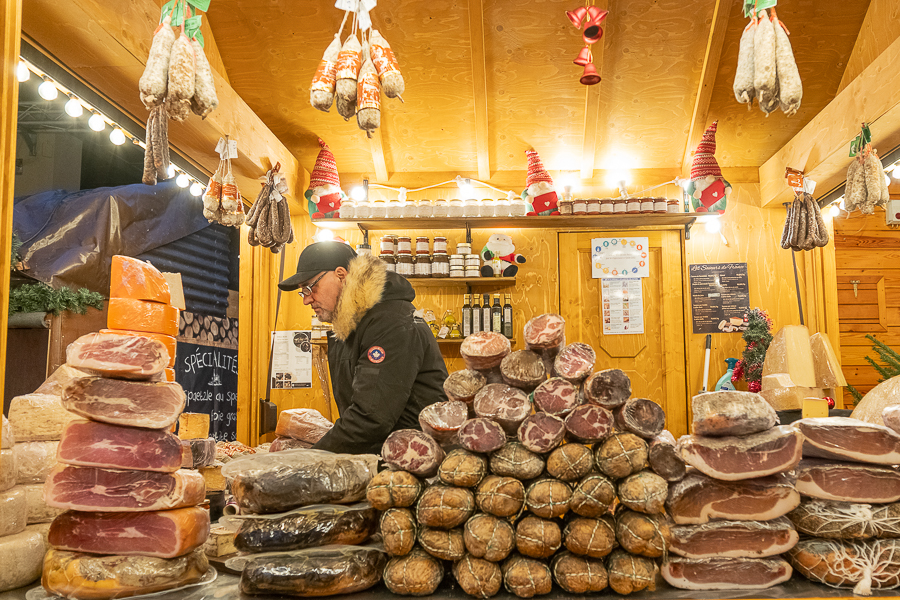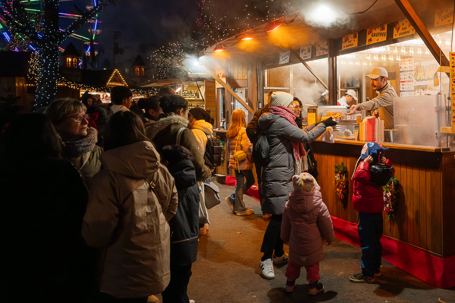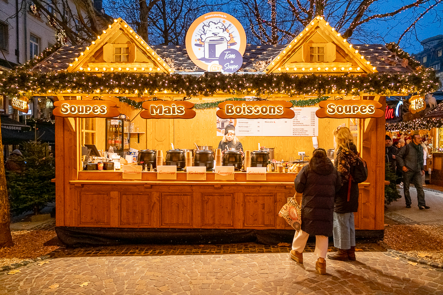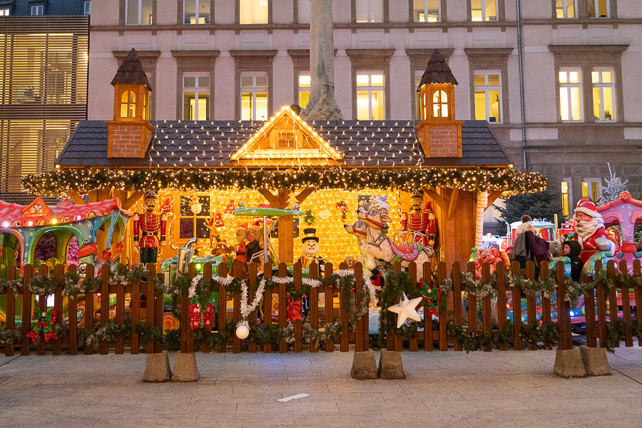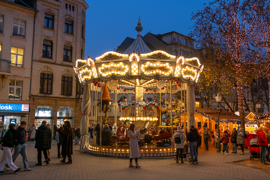 On Place de Paris in Luxembourg-Gare, the “Niklosmaart” market is split between either side of the square. One side features around eight chalets offering a variety of seasonal foods including crêpes, waffles, spätzle and fried sausages along with a Christmas carousel to keep children entertained. Seating options are limited, but this part of the market is open and easy to navigate, with queues for food and drink moving noticeably quicker than those at the larger markets.