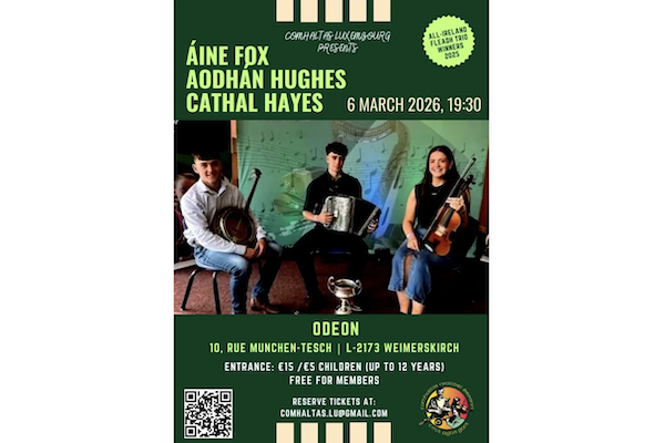 The Luxembourg branch of Comhaltas Ceoltóirí Éireann has announced that Áine Fox, Aodhán Hughes and Cathal Hayes, winners of the 2025 All-Ireland Fleadh Cheoil Trio competition, will perform a concert on Friday 6 March 2026 at 19:30 in Luxembourg-Weimerskirch.
