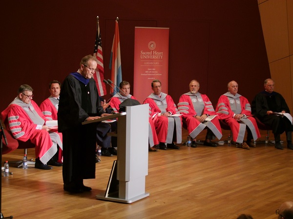 John J. Petillo, President of the Sacred Heart University, welcomed everyone, referring back 25 years ago when nobody imagined that the initiative would grow so quickly. Now there are 120 or so graduates annually here in Luxembourg, one of the many locations the university has forged world-wide. The focus has been to provide solid managerial education, with students still attraxted to the Luxembourg campus. He acknowledged that many people have been very supportive within their vision, including Jacques Santer and Dr Alfred Steinherr, Academic Director of Sacred Heart University, as well as Norbert Becker, Chairman of the Board. He also congratulated all graduates on their success.