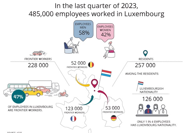 Of the 485,000 employees in Luxembourg, 47% are cross-border workers (123,000 of them from France, 53,000 from Germany and 52,000 from Belgium). 58% of Luxembourg employees are men, 42% are women.
