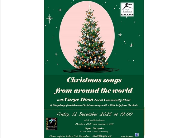 The Luxembourg European Association of Performing Arts (LEAPA) is organising a Christmas songs concert and buffet-dinner with community choir Carpe Diem at Foyer Européen in Luxembourg-Gare on Friday 12 December 2025 at 19:00.