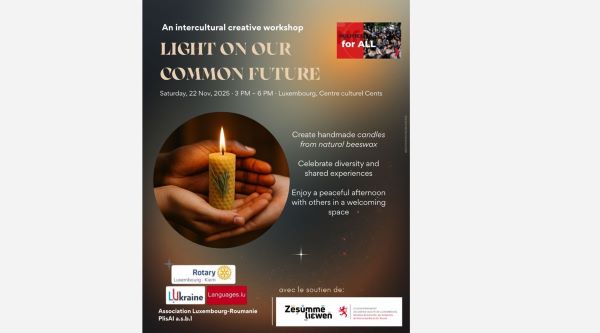 “Light on Our Shared Future” is an intercultural workshop facilitated by Ukrainian refugee Anna Dvorska and organised by Politics for All. It will take place on Saturday 22 November 2025 from 15:00 to 18:00 at the Cents Cultural Centre (167 Rue de Trèves, L-2630 Luxembourg). The session, held in English and French, will offer a practical masterclass in beeswax candle making and a collective reflection on a shared future in Luxembourg. The event is open to residents, refugees, asylum seekers and cross-border workers, with a family-friendly setting that includes supervised activities for children on-site. Participation is free but limited to 100 people and registration is required at: https://www.politicsforall.lu/post/lumière-sur-notre-avenir-commun-atelier-participatif-de-partage-interculturel