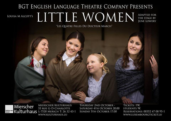 Details: A stage production of Little Women (Les Quatre Filles du Docteur March) will be performed by the BGT English Language Theatre Company from 2 - 5 October 2014 at the Kulturhaus in Mersch (53 rue Grand Duchess Charlotte), followed by run from 25-29 November at the Abbaye de Neumunster in Luxembourg-Grund.