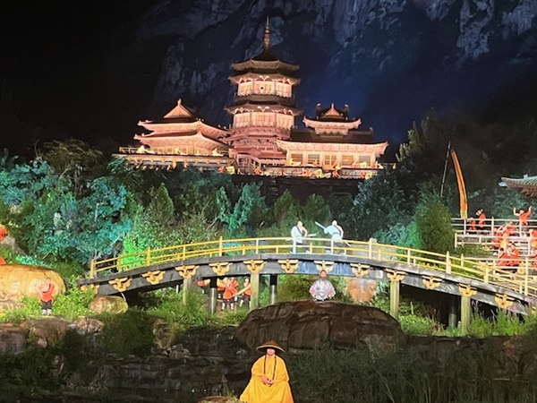 As in Louyang, there is plenty to do in Dengfeng after dark; we attended an open-air extravaganza entitled "ShaoLin Zen Music Ritual". With around 800 seats, this is by no means a small spectacle, quite the reverse, with well over a hundred performers taking advantage of the natural beauty of the mountainside, with plenty of rocks and vegetation, as well as a river running naturally through it, a waterfall to the side and a central bridge. We happened to be there when the rain decided to fall shortly before the performance started, but everybody was handed ponchos which did what they were supposed to do, keep the water off; at least it stopped raining half-way through the hour-long performance which comprised singing, acting, choreography, kung fu, performing musical instruments and much more, with the storyline focussing on the Buddhist monks and villagers living in harmony. They even incorporated live goats and horses into the performance. This stunning visual and audio spectacle is certainly not to be missed!